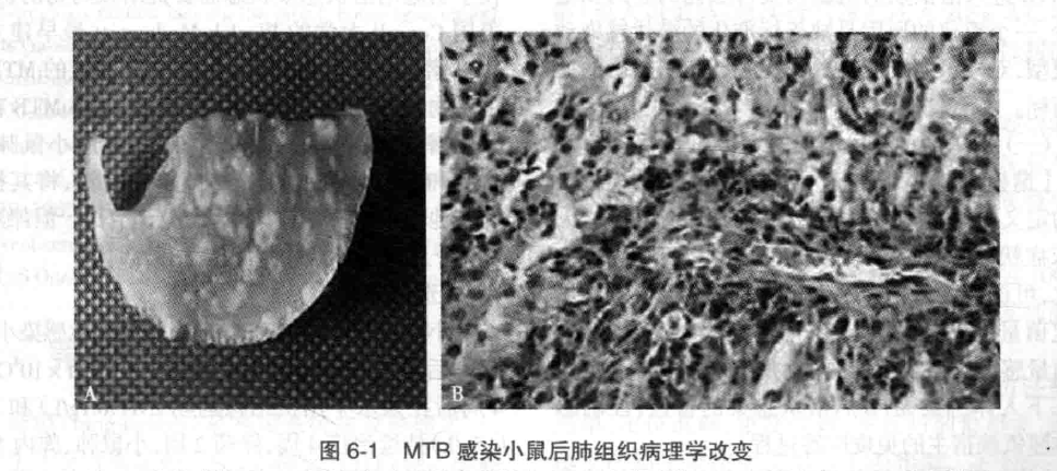 小鼠:不同品系小鼠由于其遺傳特性的不同,其對(duì)結(jié)核分枝桿菌H37Rv株敏感性也不同。如BALB/c和C57BL/6小鼠對(duì)H37Rv敏感性是DBA/2和C3H/HeJ小鼠的2倍,目前常用BALB/c和C57BL/6小鼠復(fù)制MTB感染模型。小鼠尾靜脈接種1×106CFU H37Rv標(biāo)準(zhǔn)毒株,2周后即可出現(xiàn)體重下降,狀態(tài)萎靡,剖檢發(fā)現(xiàn)肺部有明顯的肉芽腫形成(圖6-1A/文末彩圖6-1A),H&E染色后發(fā)現(xiàn)肉芽腫組織由大量上皮細(xì)胞和淋巴細(xì)胞組成,部分肺組織壞死,紅細(xì)胞滲出明顯,大量淋巴細(xì)胞和泡沫細(xì)胞聚集在支氣管及血管周?chē)▓D6-1B/文末彩圖6-1B)。小鼠脾、肺臟器研磨進(jìn)行CFU計(jì)數(shù)能獲得較高的荷菌數(shù)。為了更好地模擬MTB的感染途徑,也有采用氣霧發(fā)生器通過(guò)呼吸道感染。霧化感染實(shí)驗(yàn)的最適條件為5ml霧化液(細(xì)菌+生理鹽水)霧化90分鐘,霧化吸入MTB數(shù)以106CFU為最佳,小鼠可出現(xiàn)明顯的結(jié)核肉芽腫病變,部分呈現(xiàn)壞死性改變。