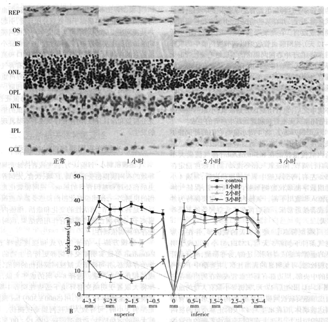 給予1~3小時光照強(qiáng)度(5000±300) lux的光輻照,均可以導(dǎo)致視網(wǎng)膜電生理功能的降低。不同時間光輻照后,ERG各測量指標(biāo)的變化與輻照時間長短有關(guān),輻照時間越長,改變越明顯,損傷越重,實驗各組間比較均有明顯的統(tǒng)計學(xué)意義。正常對照組大鼠視網(wǎng)膜組織切片結(jié)構(gòu)層次清晰,光感受器的外節(jié)盤膜排列整齊、規(guī)則,內(nèi)核層和外核層排列緊密,染色均勻。強(qiáng)光輻照對視網(wǎng)膜有明顯的損傷作用,損傷部位主要位于大鼠顳上象限區(qū)域,光損傷是一個級別反應(yīng),不同區(qū)域損傷程度差異很大。光輻照后不同時間點,視網(wǎng)膜ONL各區(qū)域厚度呈現(xiàn)明顯不同(圖12-5/文末彩圖12-5)。