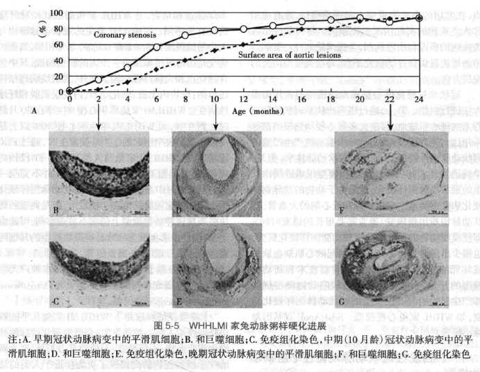 普通飼料飼喂就可出現(xiàn)高膽固醇血癥,2月齡即可出現(xiàn)冠狀動(dòng)脈粥樣硬化,10月齡和20月齡冠狀動(dòng)脈狹窄發(fā)生率分別為70%和90%(圖5-5)。