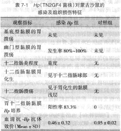 此模型中,除了常規(guī)禁食水,未做任何抑酸、抗菌、乙醇等預處理,從而沒有事先損傷胃黏膜,比較真實地反映了Hp感染的特異性作用。血清抗Hp-IgG抗體穩(wěn)定升高,與人類感染Hp后的變化相似。模型成功率高,適合于分析Hp在消化性潰瘍中的作用機制及藥物療效評價。