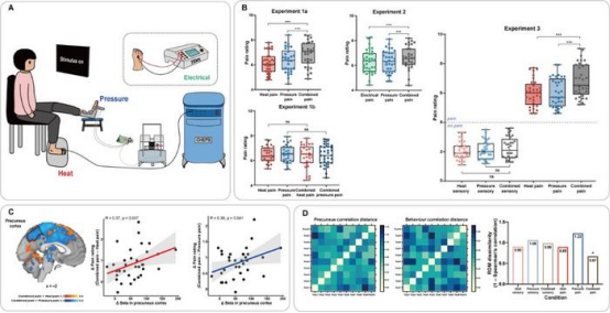 圖片信息:A. 實(shí)驗(yàn)設(shè)置;B. 在感知指導(dǎo)下,聯(lián)合疼痛評(píng)分與單一模式疼痛評(píng)分存在顯著差異;C. 楔前葉激活強(qiáng)度與疼痛整合效應(yīng)呈正相關(guān);D. 楔前葉的大腦活動(dòng)與參與者對(duì)混合疼痛狀況的疼痛感知之間具有很強(qiáng)的相似性