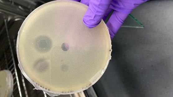 圖片信息:喜鹽古細菌Halogranum salarium在Warnecke實驗室的培養(yǎng)皿上生長。該古細菌分泌的蛋白質對一種喜鹽細菌(Halalkalibacterium halodurans)產生了抑制效應。