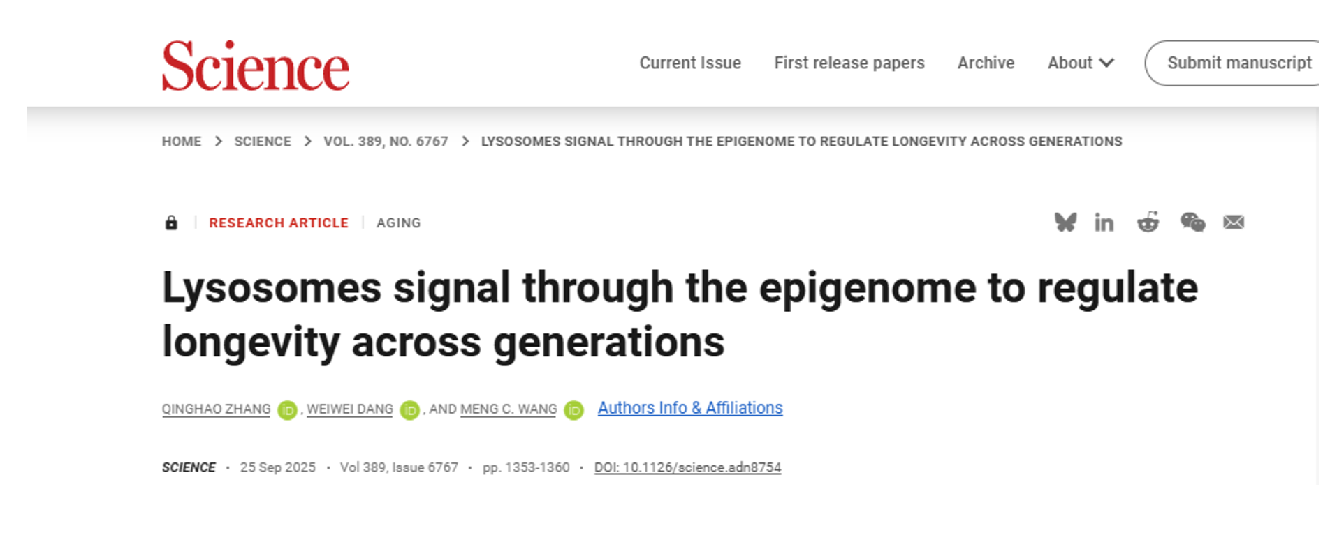 揭示跨代遺傳新機(jī)制:溶酶體以組蛋白為橋梁傳遞親代經(jīng)歷